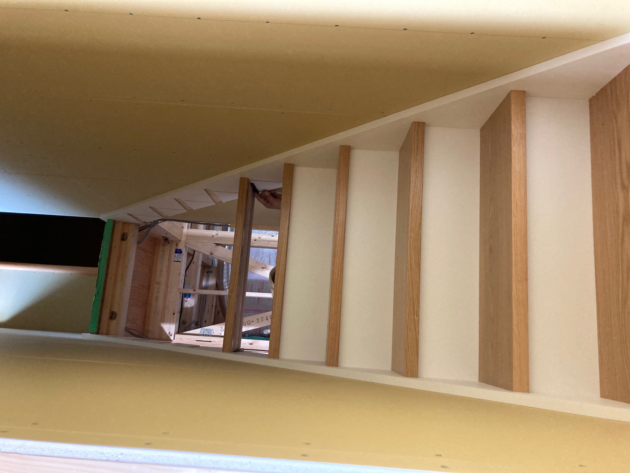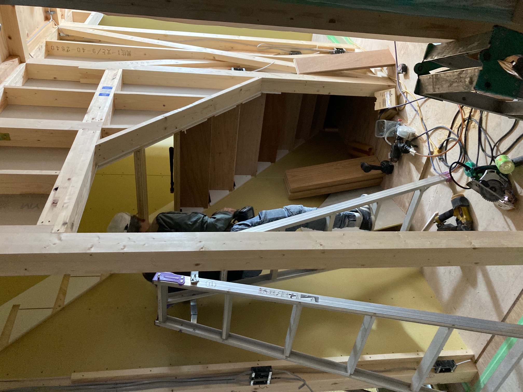階段廻りの石膏ボードが貼れるとようやく階段が設置できます。