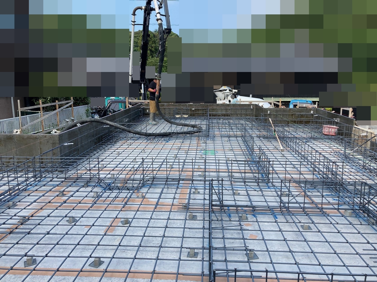 配筋検査が無事終わり、設備配管の逃げ工事(※1)が済むとコンクリートの打設です。