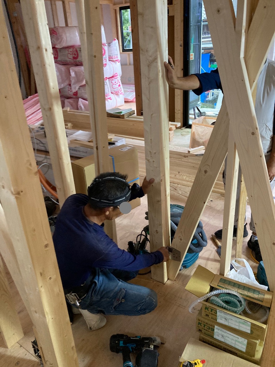 中での大工工事は筋交いや柱に構造で必要な建築金物を取り付けていきます。