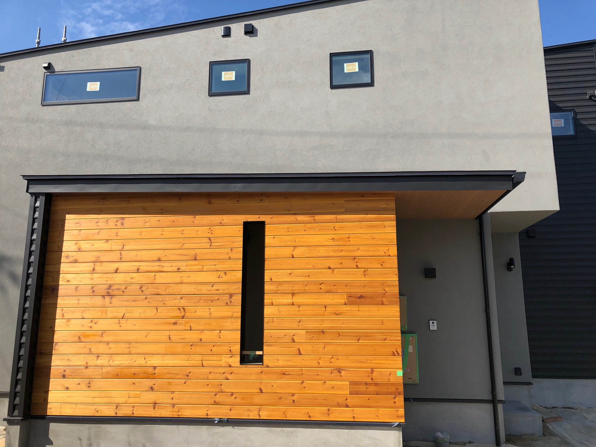外観はグレーの塗り壁とガルバリウムと木を使ってます。