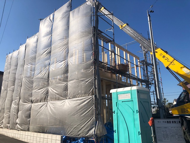 快晴の中、風も全くなく、気温も暖かく、絶好の上棟日和!