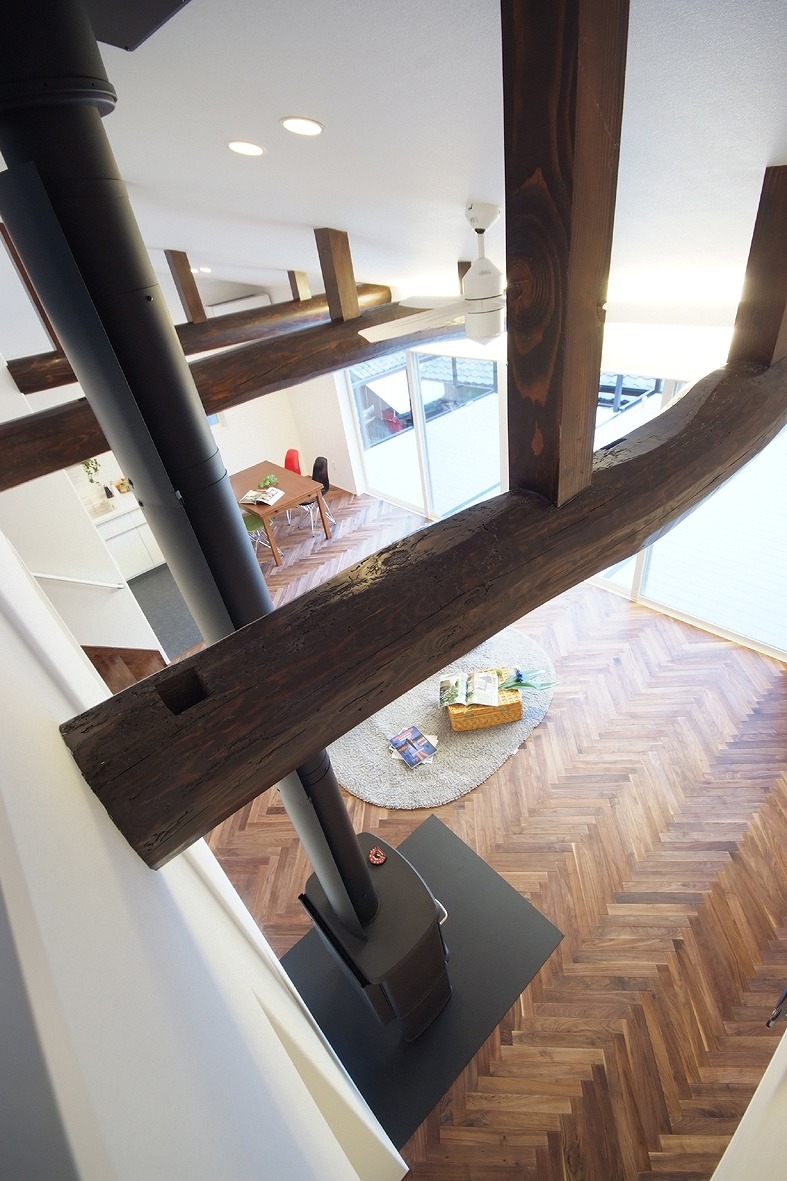 ヘリンボーンの床に丸太のあるLDKは、2階にレイアウトすることによって