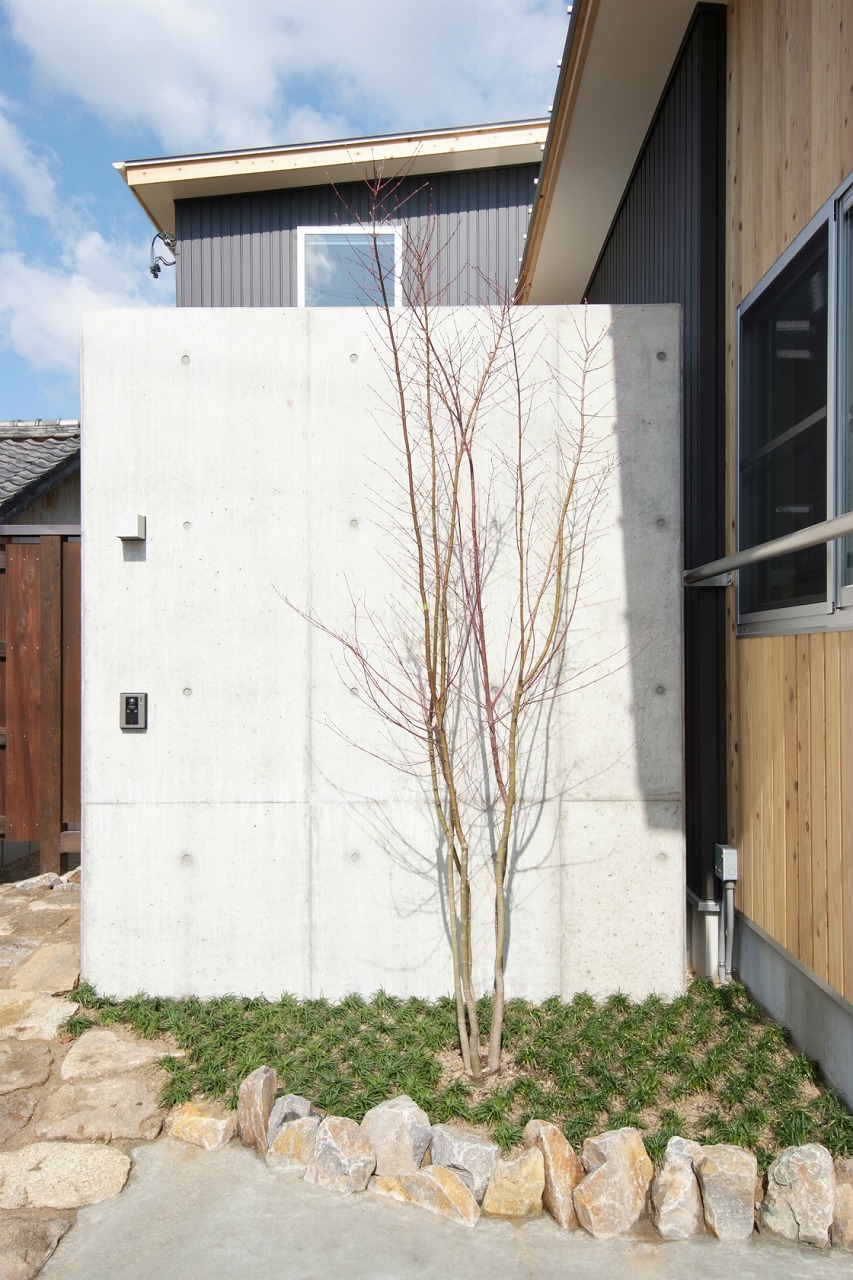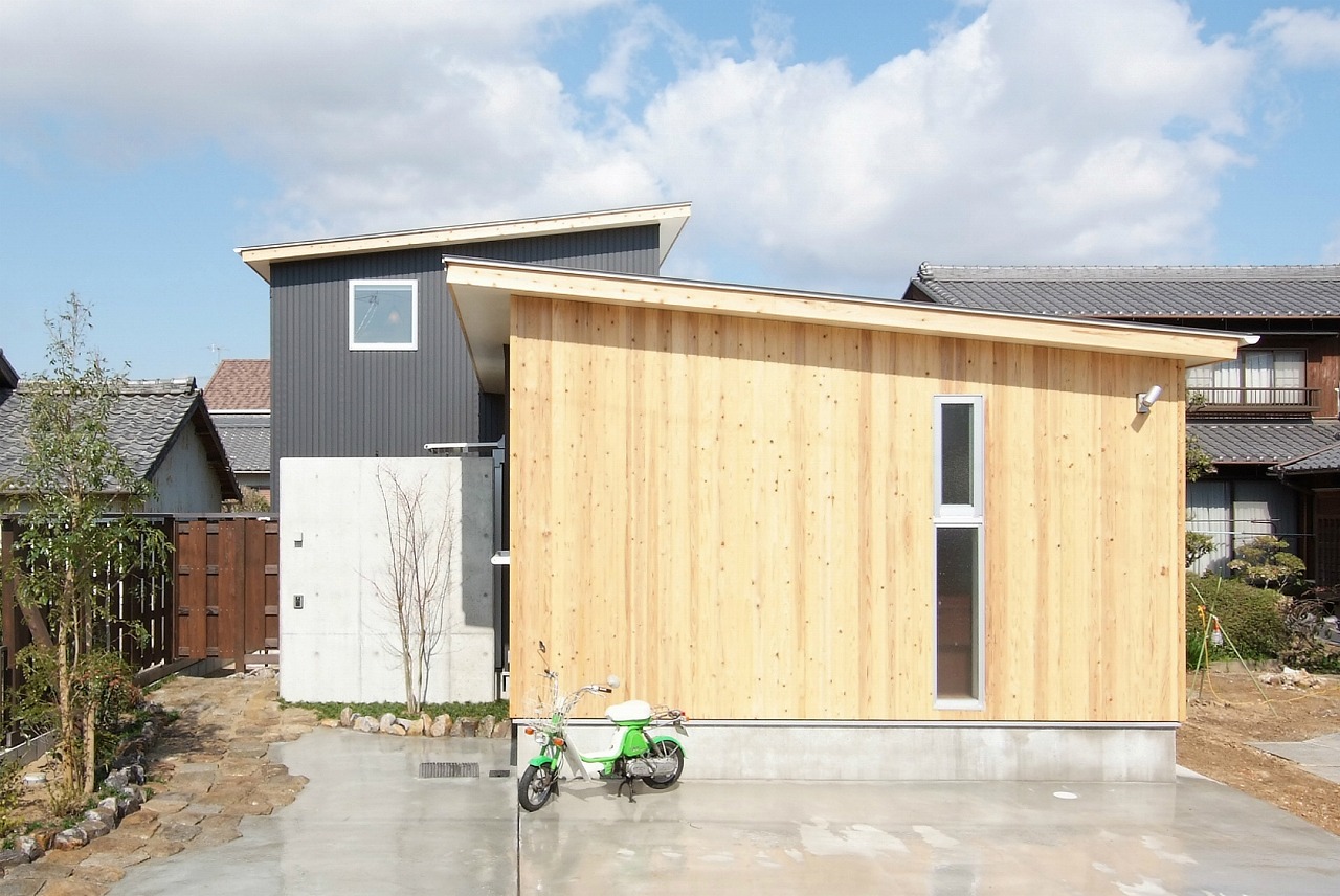 平屋部分に杉板の外壁を施し、家と共に歳を重ねていってもらうことと