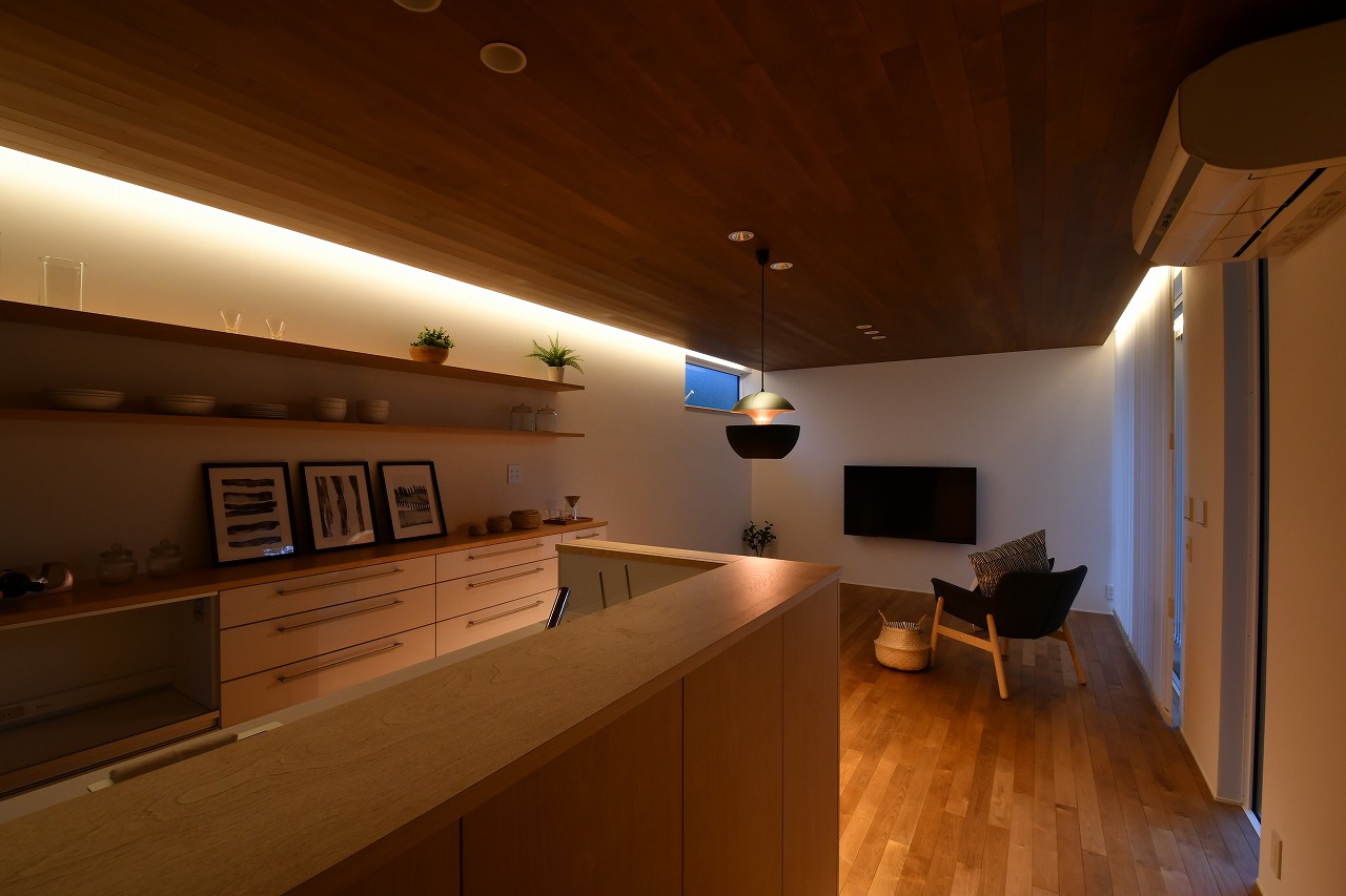バーチ材の床と天井で落ち着きのあるリビングに。